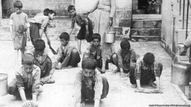 (լուսանկարը՝ Ցեղասպանութենէն փրկուած հայ որբեր Հալէպի որբանոցին մէջ, 1916 թուական)