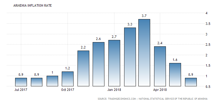 Inflation rate in Armenia eased further to 0.9 percent in June of 2018 from 1.6 percent in the previous month. It was the lowest inflation rate since August of 2017, as prices rose at a softer pace for transport (7.2 percent from 8.4 percent in May); recreation & culture (1.2 percent from 3.4 percent) and clothing & footwear (4.1 percent from 7.5 percent). Also, inflation was steady for education (2.4 percent, the same as in May). On the other hand, prices advanced faster for housing & utilities (0.5 percent from 0.4 percent); furniture & household equipment (3.3 percent from 1.6 percent); restaurant & hotels (3.9 percent from 3.7 percent); alcoholic beverages & tobacco (4.6 percent from 3.7 percent) and health (5.3 percent from 4.8 percent). Meanwhile, prices continued to decline for food & non-alcoholic beverages (-2.2 percent from -0.5 percent). On a monthly basis, consumer prices went down 1.6 percent, following a 0.1 decline in May. Inflation Rate in Armenia averaged 629.70 percent from 1993 until 2018, reaching an all time high of 22887.40 percent in June of 1994 and a record low of -5.52 percent in March of 1999.