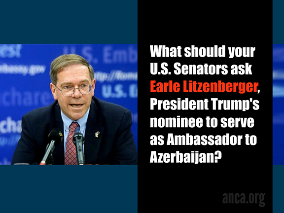 WASHINGTON—Armenian Americans, friends of Armenia, human rights activists, and advocates for peace are calling on their U.S. Senators to carefully scrutinize President Trump’s nomination of career Foreign Service Officer Earle Litzenberger to serve as Ambassador to Azerbaijan, as part of an Armenian National Committee of America nationwide advocacy campaign.