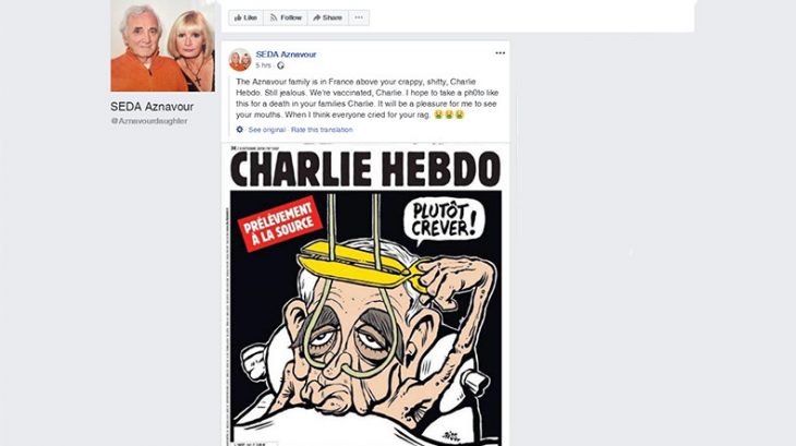 Այս նկարը զայրացուցած է Ազնաւուրի ընտանիքը: Ազնաւուրի աւագ դուստրը` Սեդա Ազնաւուր, ֆէյսպուքի իր էջին մէջ գրած է․ «Ազնաւուր ընտանիքը Ֆրանսայի մէջ բարձր կը գնտուի ձեր նողկալի, գարշելի Charlie Hebdo-էն: Դեռ կը նախանձի՞ք: Մենք պատուաստուած ենք, Շարլի: Ես յոյս ունիմ, այսպիսի նկար մը ընել ձեր ընտանիքէն մէկու մը մահուան կապակցութեամբ: Ինծի հաճելի կ՛ըլլայ տեսնել ձեր բերանները»,- գրած է Սեդա Ազնաւուր: