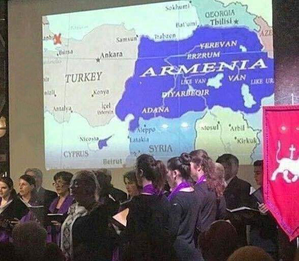 Քարտէսին վրայ Հայաստանը ներկայացուած է պատմական Հայաստանի սահմաններով, որ կը ներառէ ներկայ Թուրքիոյ արեւելեան նահանգները: