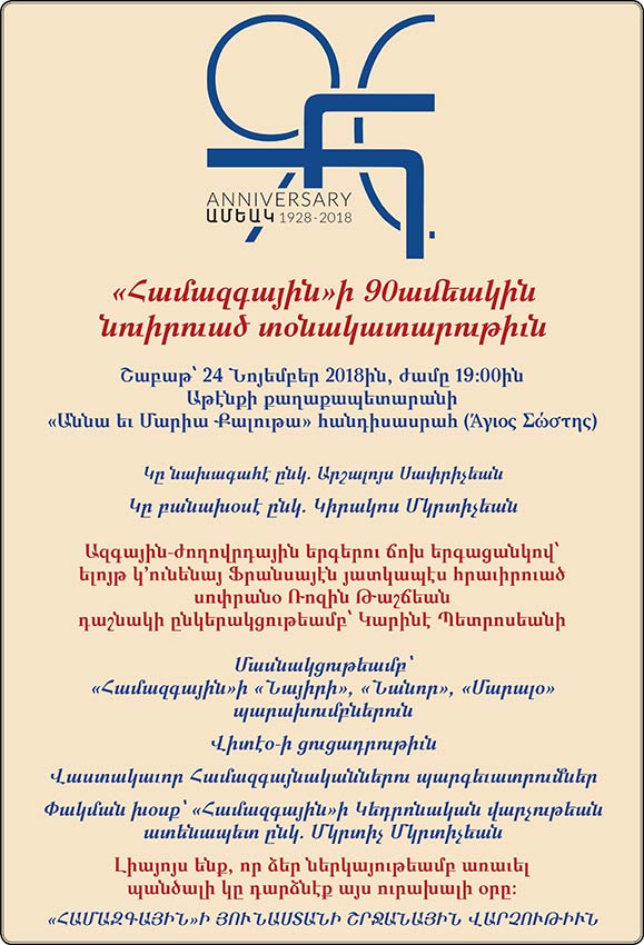 Շաբաթ՝ 24 Նոյեմբեր 2018-ին, ժամը 19։00-ին, Աթէնքի քաղաքապետարանի «Աննա եւ Մարիա Քալութա» հանդիսասրահին մէջ (Άγιος Σώστης) տեղի պիտի ունենայ Համազգայինի 90-ամեակին նուիրուած տօնակատարութիւն։