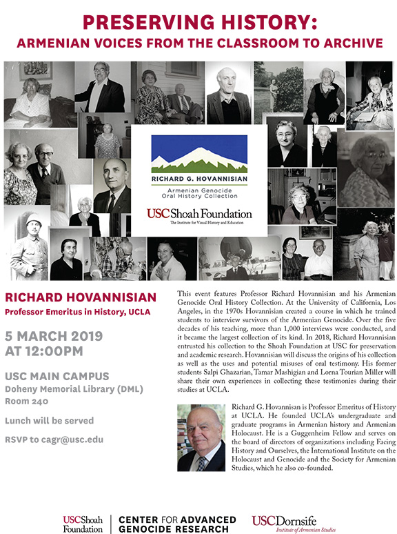 The Center for Advanced Genocide Studies and the Institute of Armenian Studies at the University of Southern California are sponsoring a noontime program on Thursday, March 5, featuring Professor Richard Hovannisian and his Armenian Genocide Oral History Collection.