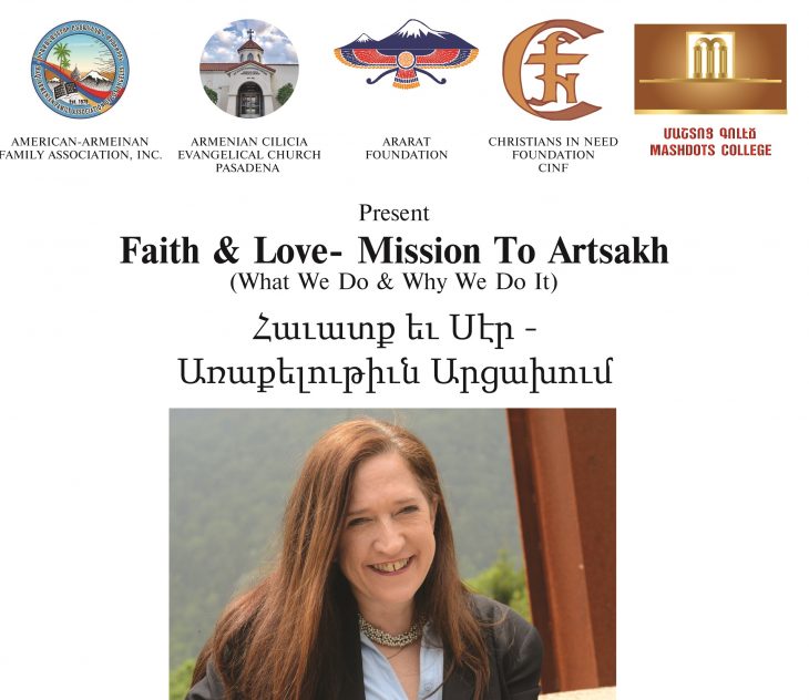 «Հաւատք եւ սէր. առաքելութիւն Արցախի մէջ» խորագրուած առաջին դասախօսութիւնը տեղի պիտի ունենայ Ուրբաթ, 21 Փետրուարին, երեկոյեան ժամը 7։30-էն սկսեալ, Փա-սատինայի Հայ Կիլիկիա աւետարանական եկեղեցւոյ «Տէրեան» սրահին մէջ, որուն հասցէն է՝ 339 S. Santa Anita Ave., Pasadena, CA 91107։