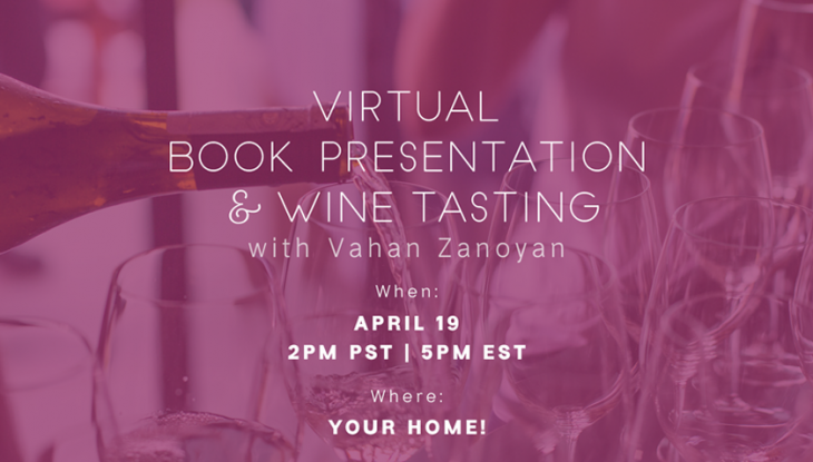 Zanoyan will briefly present his latest book, WAKING NOAH’S VINES, while actress, voice artist, and filmmaker Nora Armani will read excerpts from the book. Following the book presentation, Zanoyan will present and discuss three Armenian wines and the grapes used to make them: Koor White, Van Ardi Red, and Tushpa Red. If you have a bottle at home, save it to drink along.