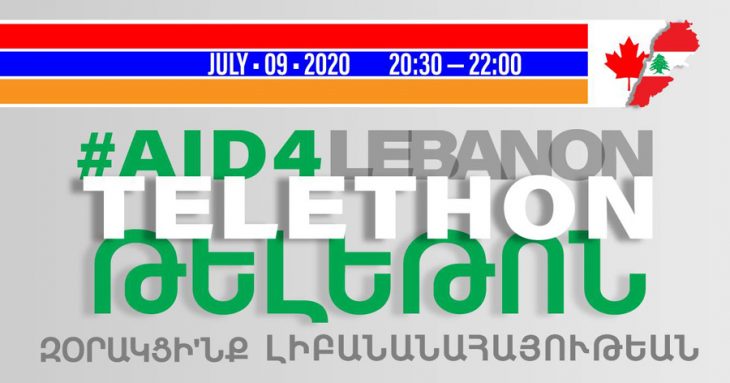 Լիբանանահայութեան Օժանդակութեան Գանատայի Մարմինի կազմակերպութեամբ, եւ մասնակցութեամբ գանատահայ միութիւններու եւ կազմակերպութիւններու, Հինգշաբթի, 9 Յուլիս 2020-ի երեկոյեան ժամը 8:30ին, ի զօրակցութիւն Լիբանանի մեր քոյրերուն եւ եղբայրներուն, տեղի պիտի ունենայ «Aid4Lebanon» թելեթոն, որ պիտի սփռուի Մոնթրէալի ICI Télévision-ի տեղական եւ առցանց կայանէն, ինչպէս նաեւ Լիբանանահայութեան Օժանդակութեան Գանատայի Մարմինի դիմատետրի՝ www.facebook.com/Aid4Lebanon էջէն: