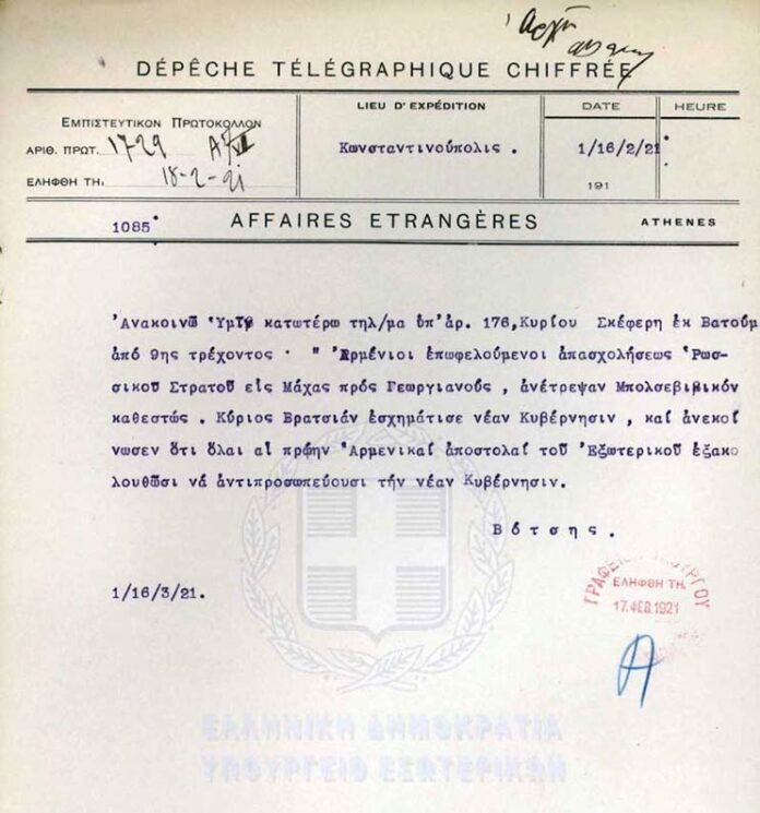 1921-ի ­Փետ­րո­ւա­րին, ­Հա­յաս­տա­նի մէջ պոլ­շե­ւի­կեան դա­ժան տի­րա­կա­լու­թեան դէմ ապս­տամ­բու­թեան ծա­գու­մէն ան­մի­ջա­պէս ետք, ­Պոլ­սոյ մէջ գոր­ծող ­Յու­նաս­տա­նի դի­ւա­նա­գի­տա­կան պա­տո­ւի­րա­կու­թեան գրա­սե­նեա­կը հե­ռա­գի­րով կը տե­ղե­կաց­նէ ­Յու­նաս­տա­նի ար­տա­քին գոր­ծոց նա­խա­րա­րու­թեան՝ ժո­ղովր­դա­յին պոռթ­կու­մին մա­սին։ ­Լու­րը նա­խա­պէս ղրկո­ւած է ­Պա­թու­մի յու­նա­կան դի­ւա­նա­գի­տա­կան կազ­մին կող­մէ ­Պոլ­սոյ յու­նա­կան դի­ւա­նա­գի­տա­կան պա­տո­ւի­րա­կու­թեան, ա­պա վեր­ջի­նը կը հե­ռագ­րէ Ա­թէնք՝ ­Յու­նաս­տա­նի ար­տա­քին գոր­ծոց նա­խա­րա­րու­թեան կեդ­րո­նա­կան սպա­սար­կու­թեան։
