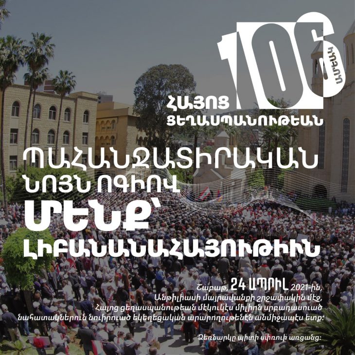 Շաբաթ, 24 Ապրիլ 2021-ի առաւօտեան ժամը 09:00-ին, Անթիլիասի Մայրավանքին մէջ Սուրբ եւ Անմահ Պատարագով պիտի ոգեկոչուի յիշատակը Հայոց Ցեղասպանութեան մէկուկէս միլիոն սրբացեալ նահատակներուն։