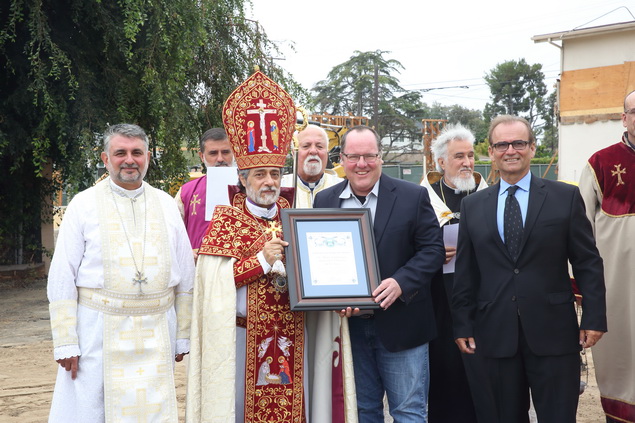 Պատարագի վերջաւորութեան, հոգեւորականներու թափորը՝ առաջնորդ սրբազանի գլխաւորութեամբ՝ առաջնորդուեցաւ դէպի եկեղեցւոյ կից նոր կառուցուելիք հանդիսութիւններու սրահին վայրը, ուր, ձեռամբ առաջնորդին, կատարուեցաւ հիմնարկէքի արարողութիւն: Արարողութեան իրենց մասնակցութիւնը բերին Արեւմտեան թեմի թեմական խորհուրդի ատենապետ Դերիկ Ղուկասեանն ու իր տիկինը, Քոսթա Մեսայի քաղաքապետ Ճոն Սթիվընսը, փոխքաղաքապետ Թիմ Անտրէա Մարը, քաղաքային խորհուրդի անդամներ` Մանուէլ Չաւեսը, Ճէֆ Հարլին, Արլիս Ռէյնոլտսը, աշխատակազմի ղեկավար Ալեքս Կոնսալեսը, ինչպէս նաեւ թեմի տարբեր ծուխերէն ժամանած հոգեւորականներ, մտաւորականներ, թեմական զանազան կառոյցներու ներկայ եւ նախկին պատասխանատուներ: