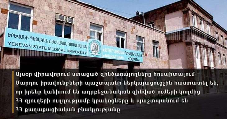 Այսօր Գեղարքունիքի մէջ վիրաւորուած զինծառայողները հիւանդանոցին մէջ Մարդու իրաւունքներու պաշտպանի ներկայացուցիչներուն հաստատած են, որ իրենք կը կանխեն ազրպէյճանական զինուած ուժերուն կողմէ ՀՀ գիւղերու ուղղութեամբ արձակուող կրակոցները եւ կը կատարեն ՀՀ քաղաքացիական բնակչութեան անմիջական պաշտպանութեան գործառոյթ: