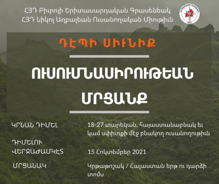 Վերոնշեալներուն լոյսին տակ եւ յատկապէս «Դէպի Սիւնիք» ծրագրի պարունակին մէջ՝ Հ.Յ.Դ. Բիւրոյի Երիտասարդական Գրասենեակը համագործակցութեամբ ՀՅԴ Նիկոլ Աղբալեան Ուսանողական միութեան հետ ձեռնարկած է Սիւնիքի անվտանգային, ապահովական, ներքաղաքական, ժողովրադագրական եւ երիտասարդութեան խնդիրներուն անդրադարձող ուսումնասիրութիւններու մրցանք մը: