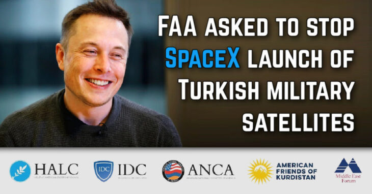 Ամերիկայի Հայ Դատի յանձնախումբը, իր ձայնը միացուց Միացեալ Նահանգներու տարածքին գործող քրտական, յունական, քրիստոնեաներու իրաւանց պաշտպան եւ միջին արեւելեան կազմակերպութիւններուն, որոնք նամակով մը կոչ ըրին օդային ճամբորդութիւններու դաշնակցային վարչութեան (FAA), որ դէմ դնէ թրքական Turksat ընկերութեան մէկ արբանեակին անջրպետ արձակումին՝ ամերիկեան SpaceX ընկերութեան կողմէ։