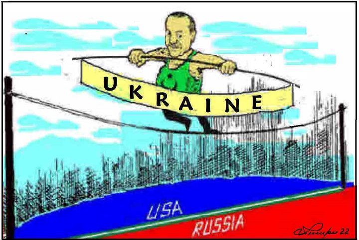 Կարելի չէ անտեսել Թուրքիոյ Էրտողանին դերակատարութիւնը, պարզ խօսքով՝ լարախաղացութիւնը: Թուրքիոյ նախագահն ալ, իբրեւ խաղաղարար միջնորդ, կրկէս մտաւ, սակայն ըստ սովորութեան, չծածկեց… ՆԱԹՕ-ին իր հաւատարմութիւնը, երբ Քիեւի մէջ բացայայտօրէն արտայայտուեցաւ Ռուսիոյ դէմ, Ուքրանիոյ մէջ «Պայրաքտար»-ներու արտադրութեան պայմանագիր ալ կնքեց, պաշտպան կանգնելով Ուքրանիոյ հողերուն ամբողջականութեան եւ Խրիմի վերադարձին: Ան բանականաբար չխօսեցաւ իր այն ախորժակներուն մասին, որոնք ուղղուած են Խրիմին, որուն համար, շուրջ 150 տարի առաջ պատերազմներ ալ մղեց ցարական Ռուսիոյ դէմ, եւ արեւմուտքի օրուան դաշնակիցները իր ետեւէն վազցուց՝ ռուսական տարածումը կասեցնելու նպատակով…: Այլ խօսքով, Էրտողանի համար ալ, Ուքրանիոյ զէնքի շուկան ունի հրապուրիչ երեսներ: Հարց է, թէ Ռուսիա որքա՞ն պիտի հանդուրժէ այսպիսի Թուրքիա մը, որուն համաթուրանական երազները կ’ընդգրկեն ո՛չ միայն հարաւային Կովկասը, անմիջականօրէն՝ Սիւնիքը, այլ նաեւ՝ նոյնինքն Ռուսիոյ կարգ մը շրջանները (Թուրքիոյ մէջ քարտէսներ ալ հրապարակ կը ներտուին, Թուրքիոյ յաջորդ կայսրութիւնը հասցնելով մինչեւ Կեդրոնական Ասիա, քերթելով Ռուսիոյ հարաւային շրջանները): Մինչ այդ, Թուրքիա կը շարունակէ հրապարակի վրայ մնալ իբրեւ ռուսական զէնքերու յաճախորդ եւ այդպէսով, (իբրեւ թէ) կը զայրացնէ Ուաշինկթընն ու դաշնակիցները, որոնք, յամենայնդէպս, աւելի՛ շօշափելի պատճառներ ունին հանդուրժելու թրքական լարախաղացութիւնը, որ խորքին մէջ մէկ արտայայտութիւնն է ՆԱԹՕ-ի հեռահաս ծրագիրներուն:
