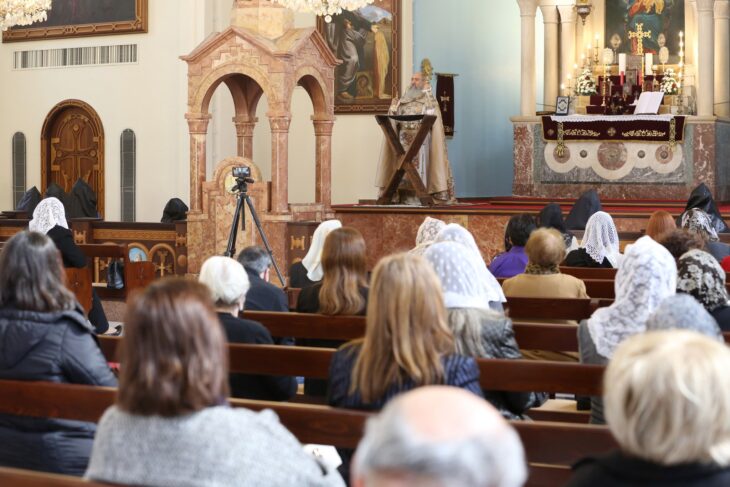 Արդարեւ, Հինգշաբթի, 24 Փետրուար 2022-ի առաւօտուն, Մայրավանքի Ս. Գրիգոր Լուսաւորիչ Մայր Տաճարին մէջ տօնին նուիրուած Ս. եւ Անմահ Պատարագ մատուցուեցաւ՝ Կաթողիկոսարանի «Նարեկացի» մանկապատանեկան երգչախումբին երգեցոութեամբ։ Ս. Պատարագը մատուցեց եւ յաւուր պատշաճի քարոզեց Կաթողիկոսարանի քրիստոնէական դաստիարակութեան բաժանմունքի վարիչ Գերշ. Տ. Մակար Եպս. Աշգարեան։ Սրբազանը իր քարոզին սկիզբը մէջբերեց Պօղոս առաքեալին եբրայացիներուն ուղղած նամակին 12-րդ գլխէն հատուած մը, ուր առաքեալը կը յորդորէ մէկ կողմ ձգել մեղքը ու համբերատարութեամբ դիմադրել փորձութիւնները, մանաւանդ երբ բազմաթիւ վկաներով շրջապատուած ենք։ Այս դիտանկիւնէն խօսելով Սրբոց Վարդանանց քաջութեան մասին, սրբազան հայրը դիտել տուաւ, որ «վասն հաւատոյ եւ վասն հայրենեաց» մղուած ճակատամարտի տօնը նորոգեց հայուն կեանքը եւ տարբեր ուժականութեամբ ամրապնդեց անոր պայքարելու եւ գոյատեւելու կամքը։ Սրբազանը ընդգծեց, որ առաքեալը այս հատուածով կը քաջալերէ հաւատացեալներուն չյուսահատիլ դժուարութիւններուն դիմաց, որովհետեւ չարին դէմ մեր մղած պատերազմները մեր սեփական պատերազմները չեն, այլ՝ Աստուծոյ, եւ, հետեւաբար, առանց խախտելու մեր վստահութիւնը Ամենակալին հանդէպ, հարկ է համբերութեամբ պայքարիլ մեզի ներկայացող փորձութիւններուն դէմ։ Այնպէս ինչպէս Քրիստոս, իբրեւ մարդ, աննկարագրելի չարչարանքներու ենթարկուեցաւ, բայց յաղթական դուրս եկաւ, նոյնպէս ալ Ղեւոնդեանք եւ Վարդանանք եւ բոլոր նահատակները, իրենց տառապանքը հաւատքով կրելով յաղթական դուրս եկան։
