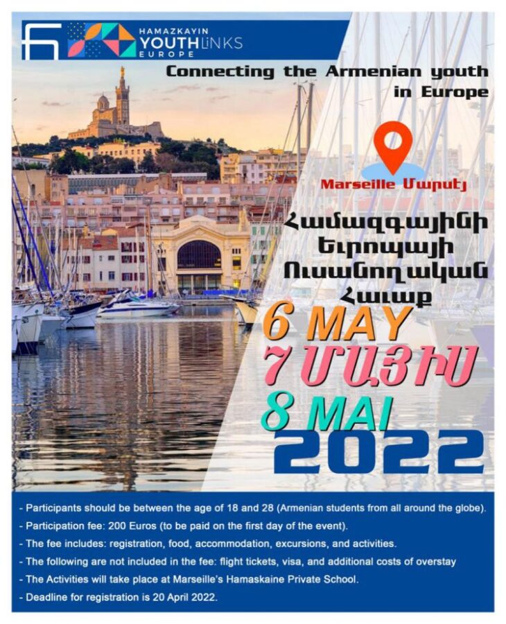 Համազգայինի Եւրոպայի ուսանողական հաւաքը այս տարի տեղի պիտի ունենայ 6-8 Մայիս 2022-ին, Մարսէյլի մէջ: