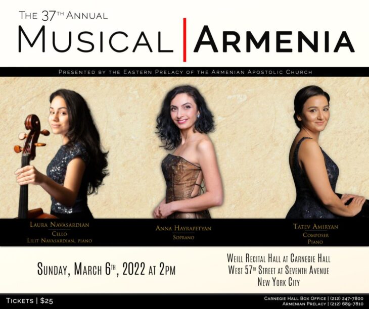 «Միւզիքըլ Արմինիա»-ի 37-րդ տարեկան համերգը տեղի պիտի ունենայ այս կիրակի, Մարտ 6-ին, կէսօրէ ետք ժամը 2:00-ին, Նիւ Եորքի աշխարհահռչակ «Քարնըկի» կեդրոնի «Ուէյլ» սրահին մէջ։ Այս մասին ԵՌԱԳՈՅՆ-ը կը տեղեկանայ «Հայրենիք»-էն։