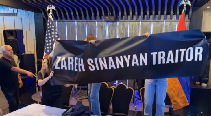 Անցեալ ամիս Սինանեանը վրդովեցուց Սփիւռքը` յայտարարելով, որ անոնք, որոնք դէմ են Արցախի եւ անոր կառավարութեան թրքամէտ դիրքորոշումներուն Փաշինեանի դաւաճանական քաղաքականութեան, «դաւաճաններ» են: Ցուցարարները Սինանեանին յիշեցուցին, որ Սփիւռքը պիտի շարունակէ զգօն մնալ Հայաստանի ապագային նկատմամբ, եւ որ ինքը եւ իր փարած վարչապետը Սփիւռքը լռեցնելու հարցով ձախողած են՝ ինչպէս Հայաստանի մէջ: