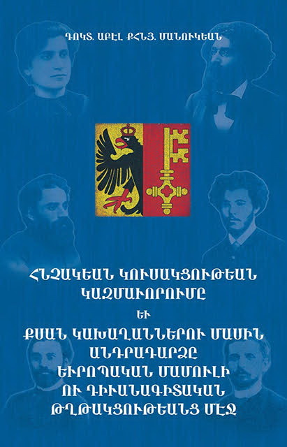 Գիրքի կողքին Հնչակեան կուսակցութեան վեց հիմնադիրներուն դիմանկարը, կեդրոնի՝ պսակադիր արծիւը ու բանալին. լուսանկարը Ժընեւի Գանթոնի զինանշանն է: