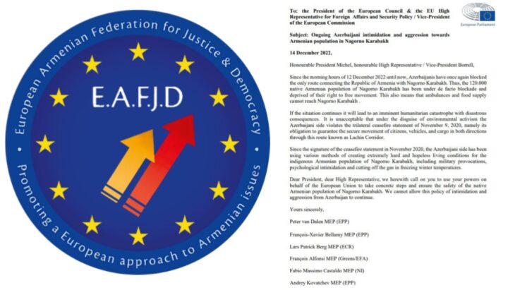 ՀՅԴ Հայ Դատի Եւրոպայի գրասենեակի հաղորդումով՝ Եւրոպական Խորհրդարանի պատգամաւորներ Փեդըր Վան Տալենը, Ֆրանսուա Խաւիէր Պելամին, Լարս Փաթրիք Պերկը, Ֆրանսուա Ալֆոնսին, Ֆապիօ Մասսիմօ Գասդալտոն եւ Անտրէյ Գովաչեւը Դեկտեմբեր 14-ին հանդէս եկած են Եւրոպական Խորհուրդի նախագահ Շառլ Միշէլին ու ԵՄ արտաքին քաղաքականութեան եւ անվտանգային հարցերու բարձր ներկայացուցիչ Ժոզէբ Պորէլին ուղղուած նամակով։