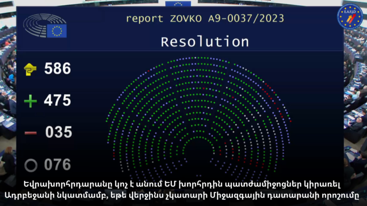 Եւրոխորհրդարանը կ՝ընդգծէ ազրպէյճանի պարտաւորութիւնները Արդարադատութեան միջազգային դատարանի 2023 թուականի Փետրուար 22-ի որոշումը կատարելու վերաբերեալ, որ կը պահանջէ ազրպէյճանէն ձեռնարկել իր տրամադրութեան տակ եղած բոլոր միջոցները՝ Բերձորի միջանցքով երկու ուղղութիւններով մարդոց, փոխադրամիջոցներու եւ բեռներու անարգել տեղաշարժը ապահովելու համար։ Այս ծիրէն ներս Եւրոխորհրդարանը կոչ կ՝ընէ ԵՄ խորհուրդին պատժամիջոցներ կիրառելու ազրպէյճանի դէմ, եթէ Դատարանի որոշումը անյապաղ չկատարուի։