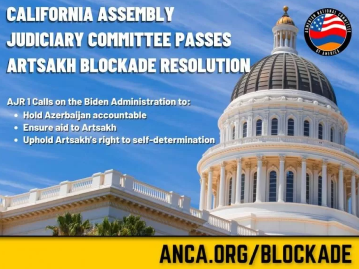 Ամերիկայի Հայ Դատի Յանձնախումբի մամլոյ հաղորդակցութեան համաձայն՝ Ամերիկայի Հայ Դատի յանձնախումբին կողմէ սատարուած հակաշրջափակման AJR 1 բանաձեւը, որ կը դատապարտէ ազրպէյճանի կողմէ Արցախի 100-օրեայ շրջափակումը, ընդունուած է Քալիֆորնիոյ Համագումարի (Խորհրդարան) դատական յանձնաժողովին կողմէ՝ երկկուսակցական ճնշող աջակցութեամբ: