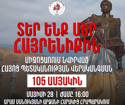 Մայիս 28-ին, ժամը 16:00-ին, Արամ Մանուկեանի արձանի մօտակայ հրապարակին վրայ տեղի պիտի ունենայ պետականութեան վերականգնման 105-ամեակին նուիրուած ձեռնարկ։