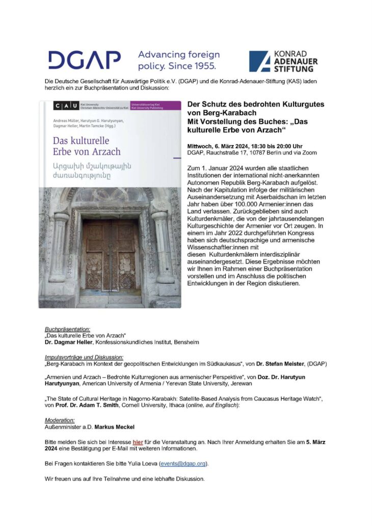 արտօնութիւն ստանալէ ետք, 6 Մարտ 2024-ին նախատեսուած «Արցախի մշակութային ժառանգութիւնը» գիրքին շնորհահանդէսը չեղարկուած է, որ