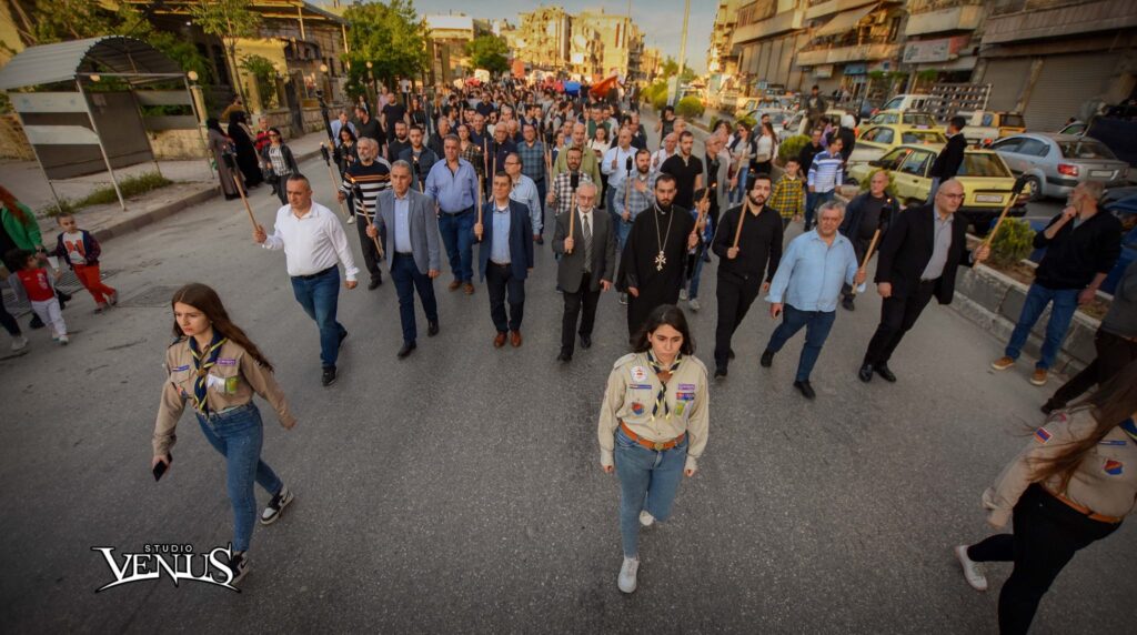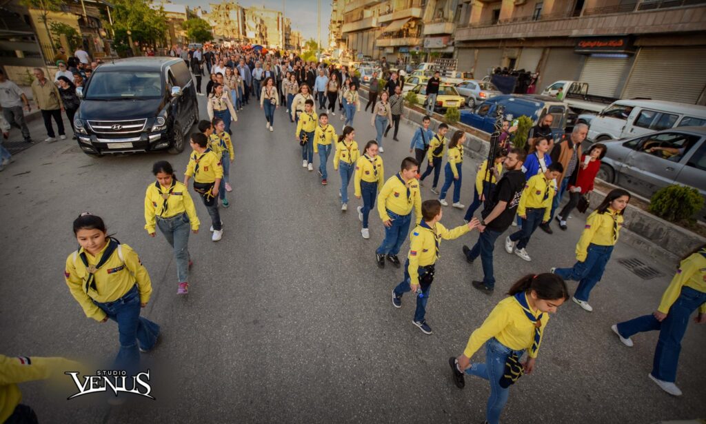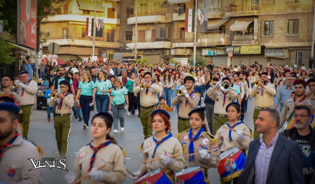 Ջահերթը Սուրիոյ եւ Հայաստանի հանրապետութեանց զոյգ դրօշներով առաջնորդեց ՀՄԸՄ-ի Հալէպ Մասնաճիւղի փողերախումբը։