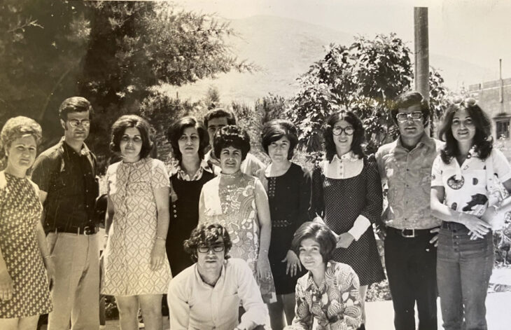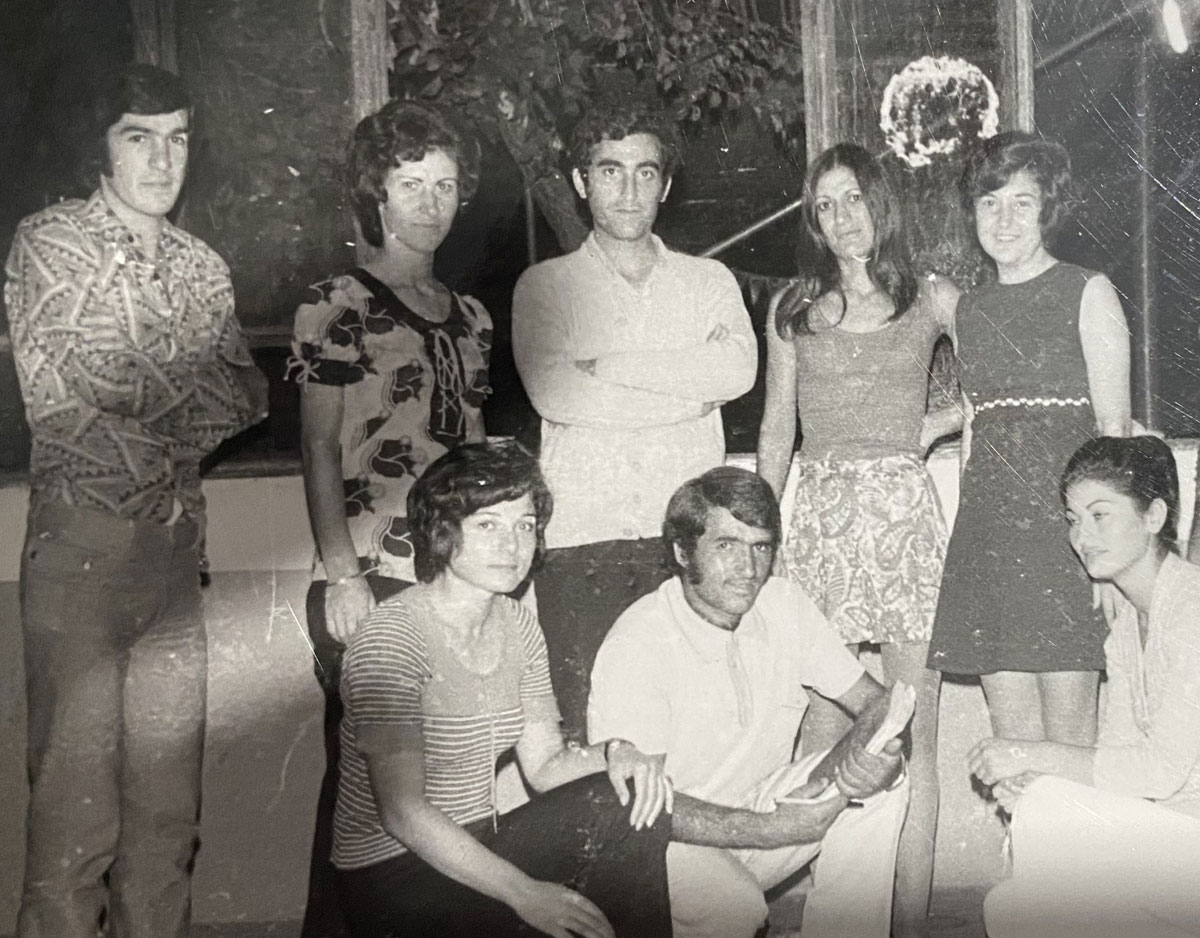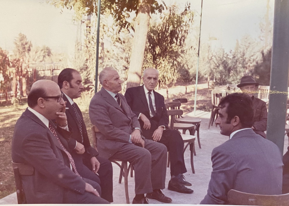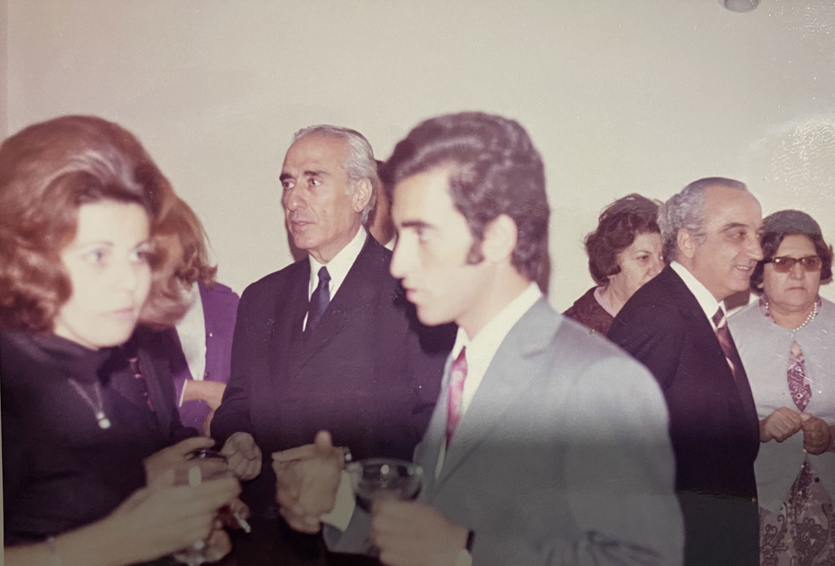 Համազգայինի Այնճարի մասնաճիւղի գլխաւոր հիմնադիր Յակոբ Փանոսեան շնորհաւորութիւններ կ՛ընդունի օրուան հիւրերէն. ակումբի բացման օրը, 1972-ին։