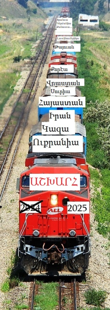 Նորագոյնը եղաւ քանի մը օր առաջ: Պահ մը ինքզինքս գտայ բաց դաշտի մը մէջ, երկաթուղիի մը կողքին: Անդիէն հռնդիւնով կու գար շոգեկառք մը (չէ՛, շոգիով բանող տեսակէն չէր), Ճակատին գրուած էր «ԱՇԽԱՐՀ», տակը՝ 2024ին վրայ ջնջումի նշանով տախտակ մը, իսկ միւս կողմը՝ 2025ով տախտակ մը: Ունէր բազմաթիւ կառքեր՝ վակոններ: Չհաշուեցի, սակայն կարծեմ 200էն աւելի ըլլալու էին. անոնց վրայ արձանագրուած էին ՄԱԿի անդամ երկիրներուն, թեկնածուներու եւ տակաւին անկախութեան սպասող երկիրներու անունները: