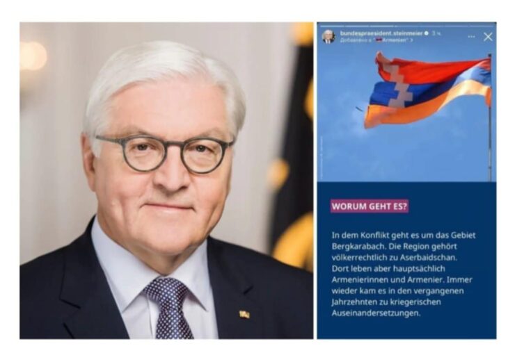 Արդարեւ, տարածաշրջան այցելող Շթայնմայըր, որուն առաջին հանգրուանը Երեւանն էր, իր ընկերային ցանցին վրայ հրապարակեց Արցախի դրօշակով լուսանկար մը եւ արդար նշում մը կատարեց արցախահայութեան մասին: «Ինսթակրամ»-ի իր պաշտօնական էջին մէջ, ան գրած էր հետեւեալը․- «Հակամարտութիւնը կը վերաբերի Լեռնային Ղարաբաղի տարածքին: Տարածաշրջանը իրաւականօրէն կը պատկանի Ատրպէյճանին: Այնտեղ հիմնականին մէջ հայեր կ՛ապրին: Վերջին քանի մը տասնամեակներուն, բազմիցս բախումներ տեղի ունեցած են»։ Թէեւ այս տողերը կիսատ-պռատ եւ հպանցիկ արտայայտութիւններ էին, անոր կողքին՝ տեսողական բաժինն էր, որ զայրացուց Պաքուն, երբ կարդացողները տեսան, որ Արցախի դրօշը կ՛ընկերանար տողերուն: Ի դէպ, չենք մոռնար, որ այս նախագահը անցեալին հայութեան եւ այլոց իրաւունքներուն մասին շատ աւելի յստակ եւ արդար կեցուածք ունեցած է:
