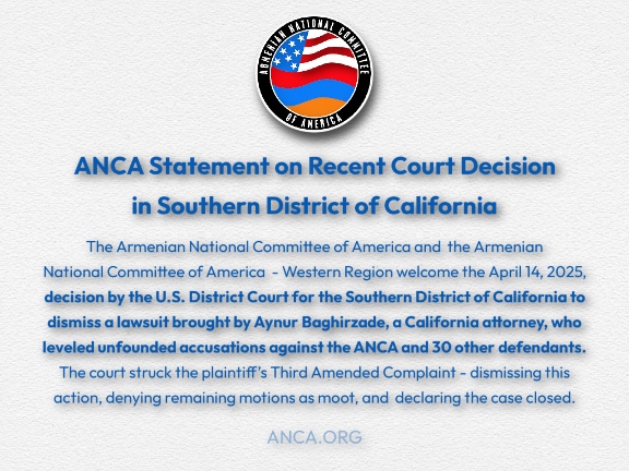 Ամերիկայի Հայ Դատի յանձնախումբը եւ Արեւմտեան Ամերիկայի Հայ Դատի յանձնախումբը ողջունեցին Քալիֆորնիոյ հարաւային շրջանի դաշնակցային ատեանի որոշումը, որ կը մերժէր ատրպէյճանցի Այնուր Պաղիրզատէի կողմէ Հայ Դատին դէմ ներկայացուցած դատին քննարկումը: