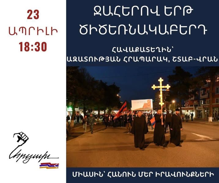 Արցախցիներու իրաւունքներու պաշտպանութեան խորհուրդը կը նախատեսէ Ապրիլ 23-ին, ժամը 18:30-ին կարճ միջոցառում կազմակերպել Երեւանի Ազատութեան հրապարակին վրայ՝ Հայոց Ցեղասպանութեան 110-րդ տարելիցին առիթով, որմէ ետք երթով կ՝երթանք Հանրապետութեան հրապարակ՝ միանալու աւանդական ջահերթին:
