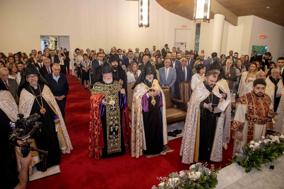 Արդարեւ, այդ օր, բարձր տրամադրութեամբ եւ ծաղկազարդեան ցնծութեան մէջ, հոծ թիւով հաւատացեալներ համախմբուած էին Սրբոց Հրեշտակապետաց Հայց. Առաք. եկեղեցւոյ մէջ՝ դիմաւորելու Արամ Ա. վեհափառը եւ իր շքախումբը ու ականատեսները ըլլալու նորակառոյց եկեղեցւոյ Ս. խորանի օծման եւ զայն միւռոնաբոյր դարձնելու պատմական արարողութեան:
