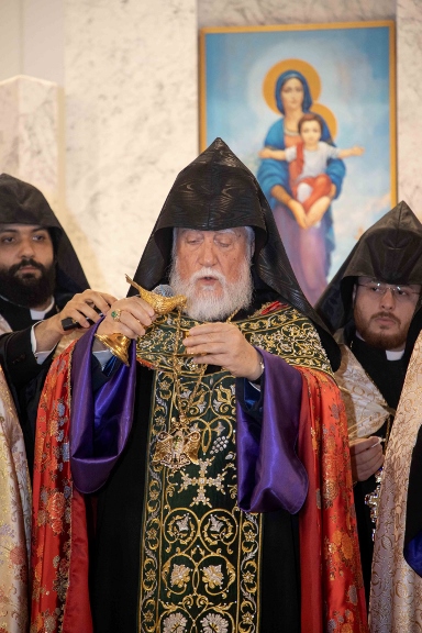 Հայրապետը ամպհովանիի ներքեւ, զոր կը բարձրացնէին Արման Մելքոնեան, Րաֆֆի Մելքոնեան, Փիթըր եւ Գեւիկ Պաղտասարեան եղբարք, արժանավայել թափօրով եւ «Հրաշափառ Աստուած» գեղահիւս շարականի կշռոյթին տակ մուտք գործեց եկեղեցի, շրջապատուած թեմիս առաջնորդ Գեղամ արք. Խաչերեանի, երեք սրբազաններու, երկու ծայրագոյն վարդապետներու, երեք վարդապետներու, քահանայ հայրերու եւ հաւատացեալներու ուղեկցութեամբ: Շքախումբին մաս կը կազմէին նաեւ Կեդրոնական վարչութեան համաատենապետները եւ անդամներ: Ներկայ էին թեմիս Ազգային իշխանութեան ատենապետը եւ անդամներ, հիւրեր ու բարերար ամոլին ընտանիքի անդամները, ինչպէս նաեւ իրենց սիրեցեալ մայրը՝ Անժէլը, որուն ի պատիւ եկեղեցին անուանուած է Ս. Հրեշտակապետաց եկեղեցի: