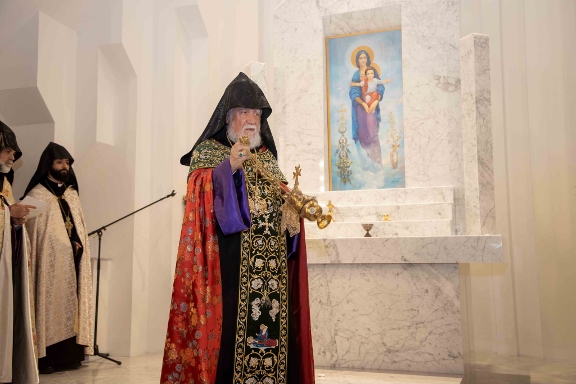 Ապա Արամ Ա. վեհափառը իր բարձր հայրապետական գնահատանքը յայտնեց եկեղեցւոյ բարերար Վարանդ եւ Հուրի Մելքոնեան ամոլին, անոնց կատարած աստուածահաճոյ բարերարութեան համար: «Եկեղեցի շինել կը նշանակէ Աստուծոյ տունը շինել», ըսաւ կաթողիկոսը: Այնուհետեւ, վեհափառը իրենց մաղթեց երկնային օրհնութեամբ լեցուն առողջ եւ երկար տարիներ: