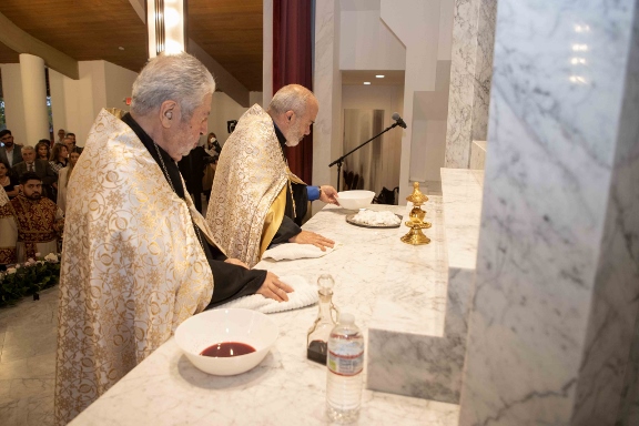 Օծման սրբազան արարողութիւնը տեղի ունեցաւ ձեռամբ Արամ Ա. հայրապետին, մասնակցութեամբ Գեղամ, Մուշեղ, Թորգոմ եւ Տաճատ սրբազաններուն: Խորհրդաւոր էր պահը: Փոխադարձ սաղմոսացութիւններու եւ շարականներու ուղեկցութեամբ տեղի ունեցաւ եկեղեցւոյ Սուրբ խորանի օծումը Սրբալոյս Միւռոնով: Իրագործուած էր սրբազնագոյն խորհուրդը: Հրեշտակներու երկնային մեղեդիներու, Աստուծոյ հայրական լոյս հովանաւորութեան ներքեւ եւ Ս. հոգիի ճառագայթող ներգործութեամբ պահը դարձաւ վեհ եւ սրբազան: Արդարեւ երկինքը եւ երկիրը կ՛ողջունէին զիրար: