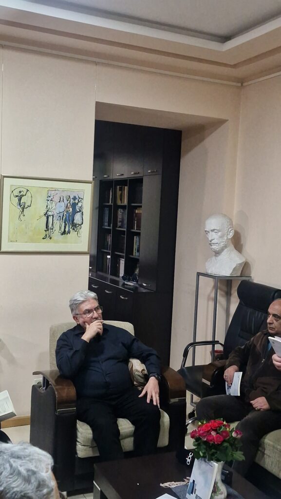 Շնորհանդէսը շարունակուեցաւ գրողի հետ զրոյցով, որ կը վարէր «Թորոնթոհայ» ամսագրի խմբագիր Ռուբէն Ճանպազեան։ Զրոյցին ընթացքին ներկաները հնարավորութիւն ունեցան բացայայտելու բանաստեղծին խորունկ աշխարհը, անոր ընկալումները բառ ու բանի շուրջ, հոգեհարազատ թեմաներն ու գրական ազդեցութիւնները, ինչպէս նաեւ` անոր մտորումները Սփիւռքի ու Հայրենիքի մէջ ստեղծուող ժամանակակից գրականութեան խնդիրներուն շուրջ։