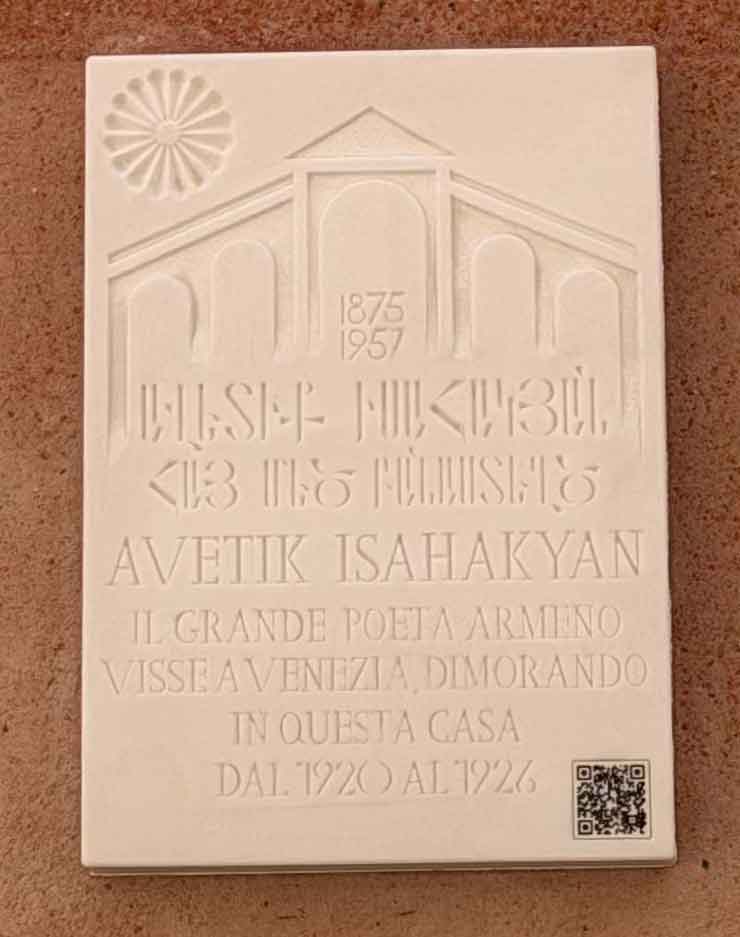 Աւետիք Իսահակեանի ծննդեան 150-ամեակի յոբելեանին առիթով 17 ապրիլին Վենետիկի մէջ կատարուեցաւ յուշաքարի մը քողազերծման արարողութիւնը մուտքի կողքին այն տան, ուր վաստակաւոր հայ գրողը բնակած է 1921-1926 այսպիսով քաղաքին լաբիւրինթոսային քարտէսին աւելցնելով յուշաքար մը եւս, որ կը խորհրդանշէ վենետահայ հարուստ եւ հազարամեայ պատմութիւնը: