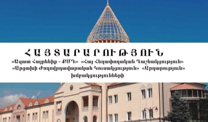 Արցախի Հանրապետութեան Ազգային Ժողովի«Ազատ հայրենիք-ՔՄԴ», «Արդարութիւն», «Հայ Յեղափոխական Դաշնակցութիւն» եւ «Արցախի ժողովրդավարական կուսակցութիւն» խմբակցութիւնները հանդէս եկած են համատեղ յայտարարութեամբ. Սիրելի´ հայրենակիցներ Ազգային ժողովին կողմէ Արցախի Հանրապետութեան նախագահի ընտրութիւնը լուրջ եւ, […]
