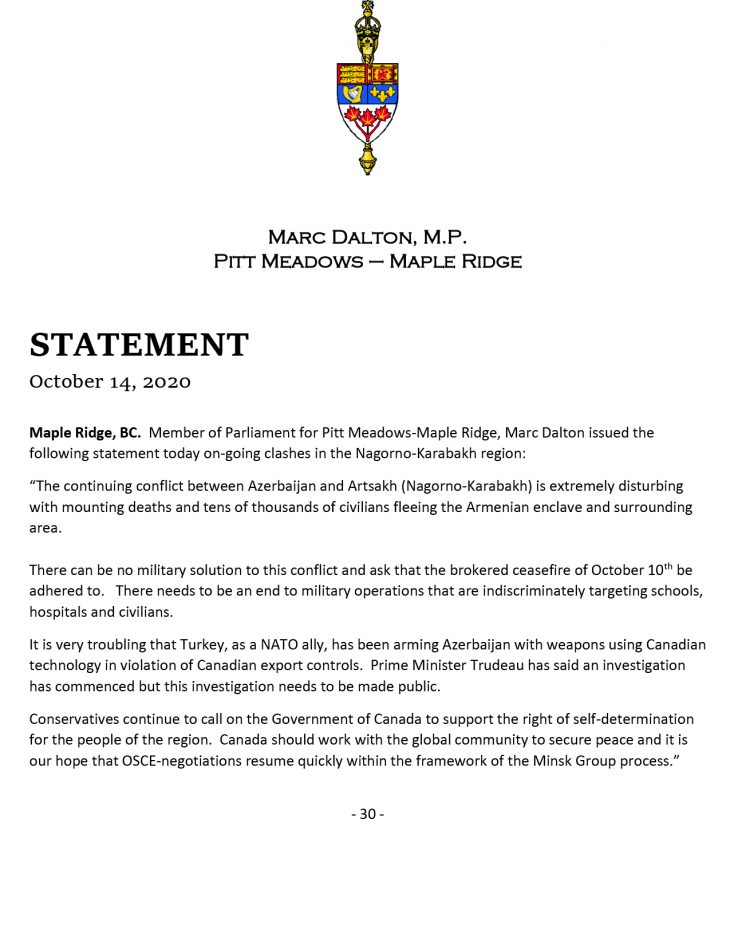 Maple Ridge, BC. Member of Parliament For Pitt Meadows-Maple Ridge, Marc Dalton issued a Statement Regarding The On-going Clashes in The Nagorno-Karabakh Region